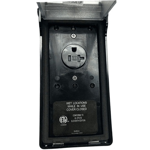 Part number 39453. Watkins 20 amp GFCI bubble cover. Comes with ground post up, can be rotated to have ground post down.